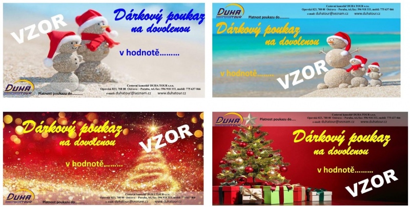 Vyberte si z naší nabídky DUHA TOUR s.r.o. co by se jim mohlo asi tak líbit a my pro Vás připravíme ve Vámi určené hodnotě dárkový poukaz. Pořádáme pobytové zájezdy do Chorvatska, termální lázně na Slovensku, Polsku i Maďarsku, poznávací zájezdy, jednodenní zájezdy atd.. Konečný výběr zájezdu už necháte na obdarovaném, rádi mu pak při výběru poradíme,