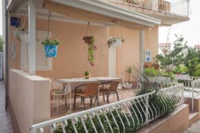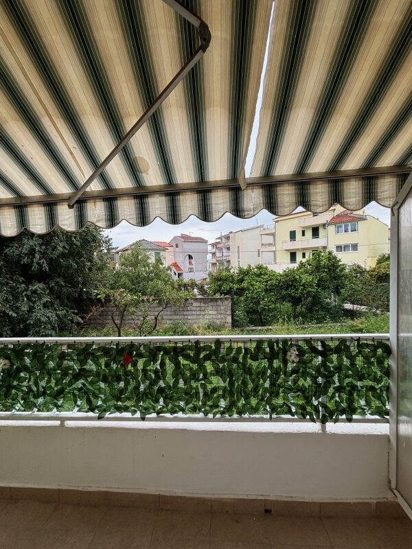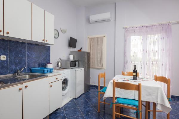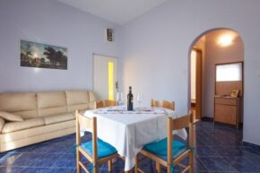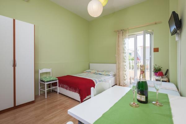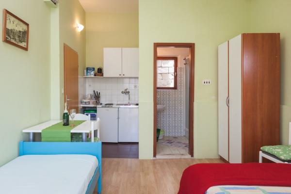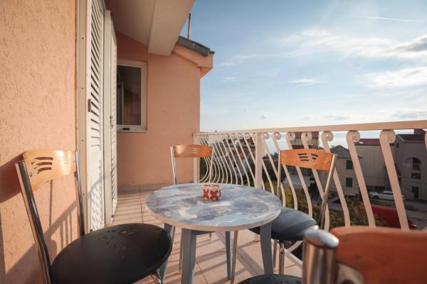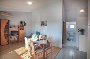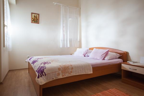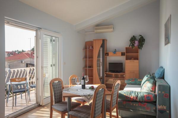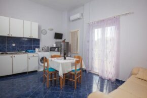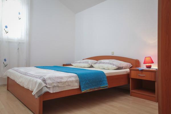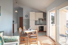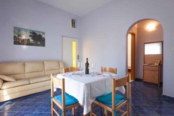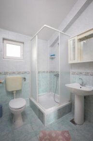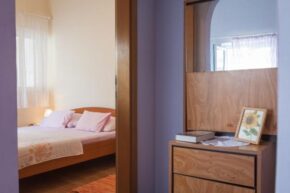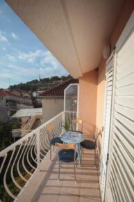 Apartmán 1/4 – č. 3 (2. patro) – Apartmán je rozdělen na dvě části, v jedné se nachází ložnice s dvoulůžkem, v druhé místnosti obývací část s rozkládacím gaučem a balkonem, který má  výhled na moře. Kuchyňský kout je plně vybaven, je zde lednice, vařič, mikrovlnná trouba. Součástí vybavení je TV, SAT, WiFi, klimatizace a WC se sprchovým koutem. Možnost využití automatické pračky.